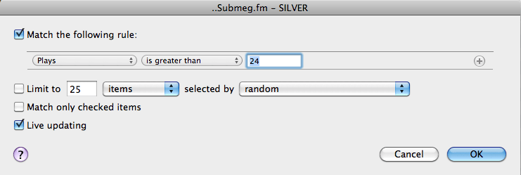 One thing that makes iTunes nifty is Smart Playlists. The ability to create a playlist of songs that meet particular criteria is quite useful, and can easily help group similar songs. I am going to list the smart playlists that I have created that I have found extremely useful. BOOKMARK THIS PAGE and come back every so often to have a squiz at any new ones I have created. Another good resource for this is at the iTunes Lounge. They have a whole thread dedicated to them!